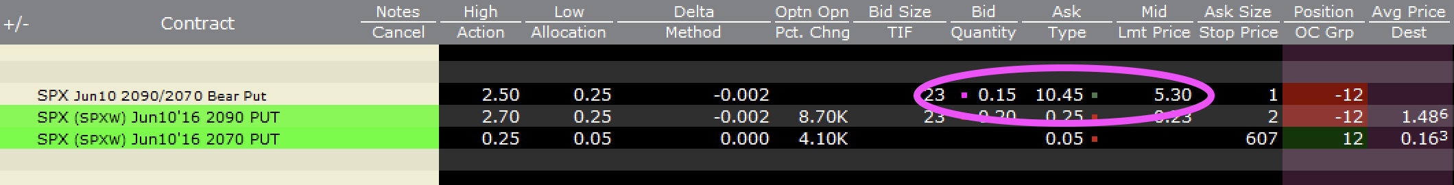 #SPXcampaign Here’s a good example of why you should avoid automated stops on spreads, especially SPX spreads. This is a screen shot from my broker I just took. It’s the spread I sold this morning, 2090/2070. Bid is .15 and ask ia 10.45, so Mid is 5.30! If I had put a 3.00 auto-stop on it, it would have survived the whole day until a few minutes ago. Of course, the bid/ask can get wacky when it’s about to expire in 30 minutes (and also first thing in the morning, and after hours), but this kind of anomaly can happen at any time and slam you out of your spread with a horrible fill.