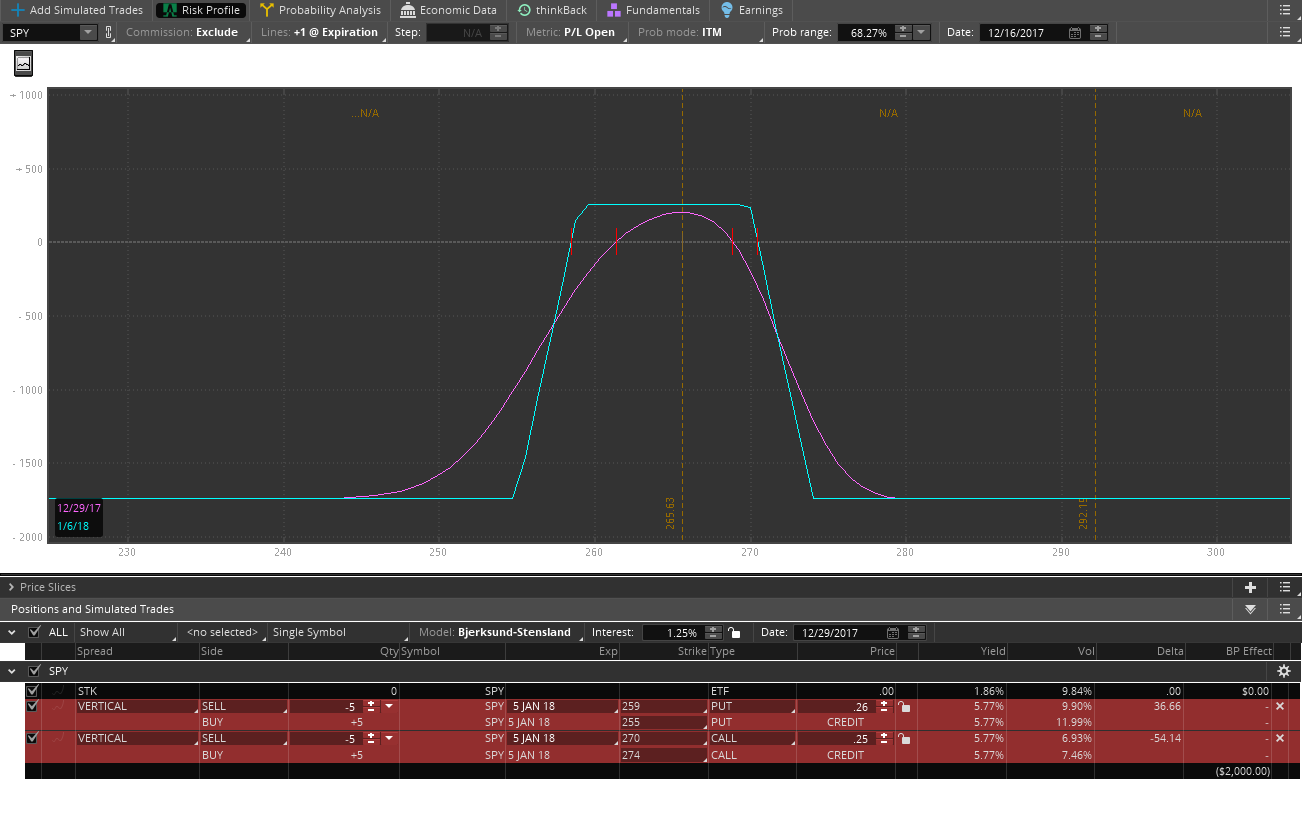 Looking at 21 DTE in am at 259/255 put spread and 270/274 call spread for 0.25-0.26 each side. 5 contracts brings in $255 with max risk of $2000. Will see where we open, if we bounce just open put side, if down overnight call side. Then add other side at next reversal.