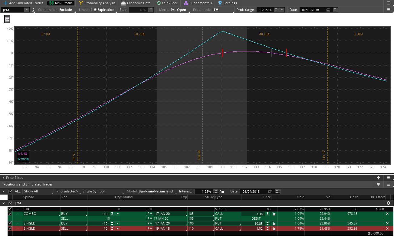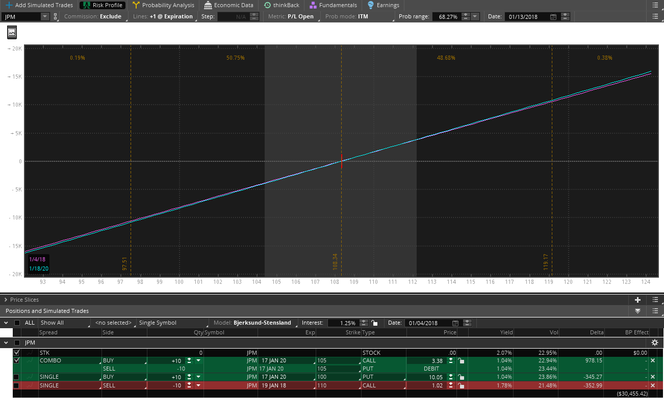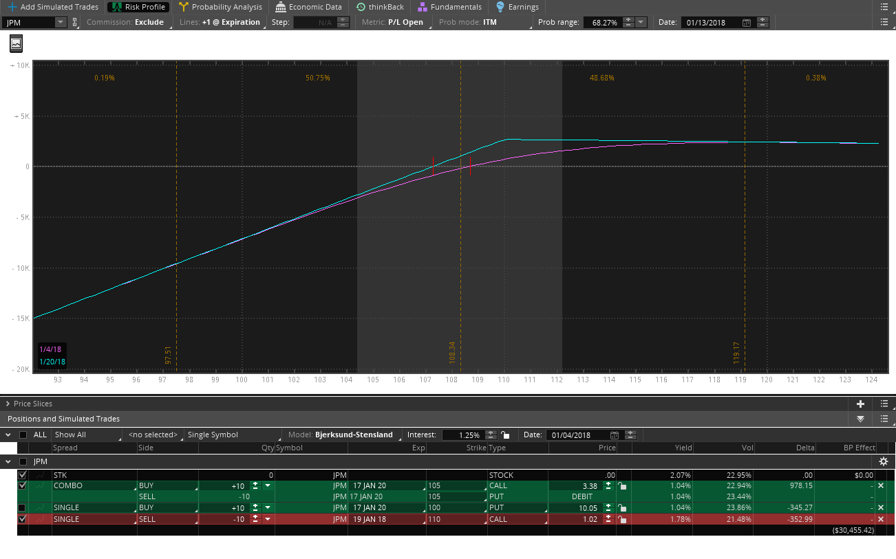 Short post, promise but a few graphs that will take up some space. JPM as example. First graph is a synthetic long selling a 1 week 110 call without the downside protection. Looks like a regular covered call and it should, it is a synthetic covered call (this is what motley fool does a lot of). Second graph uncapped, looks like buying stock but there is no downside protection so would have to have the cash or margin to buy at the put strike. Third graph is a #fuzzy with 5 point disaster protection put. Looks more like a long calendar spread because of the extra cost of the put protection. That is why you would want to sell weekly or monthly calls against it, to lower the cost basis on the debit of the leap spread and the put protection. I personally would probably go 10 points wide but this shows you could do it in a recently funded IRA for 5000 max risk if JPM is not too big to fail.