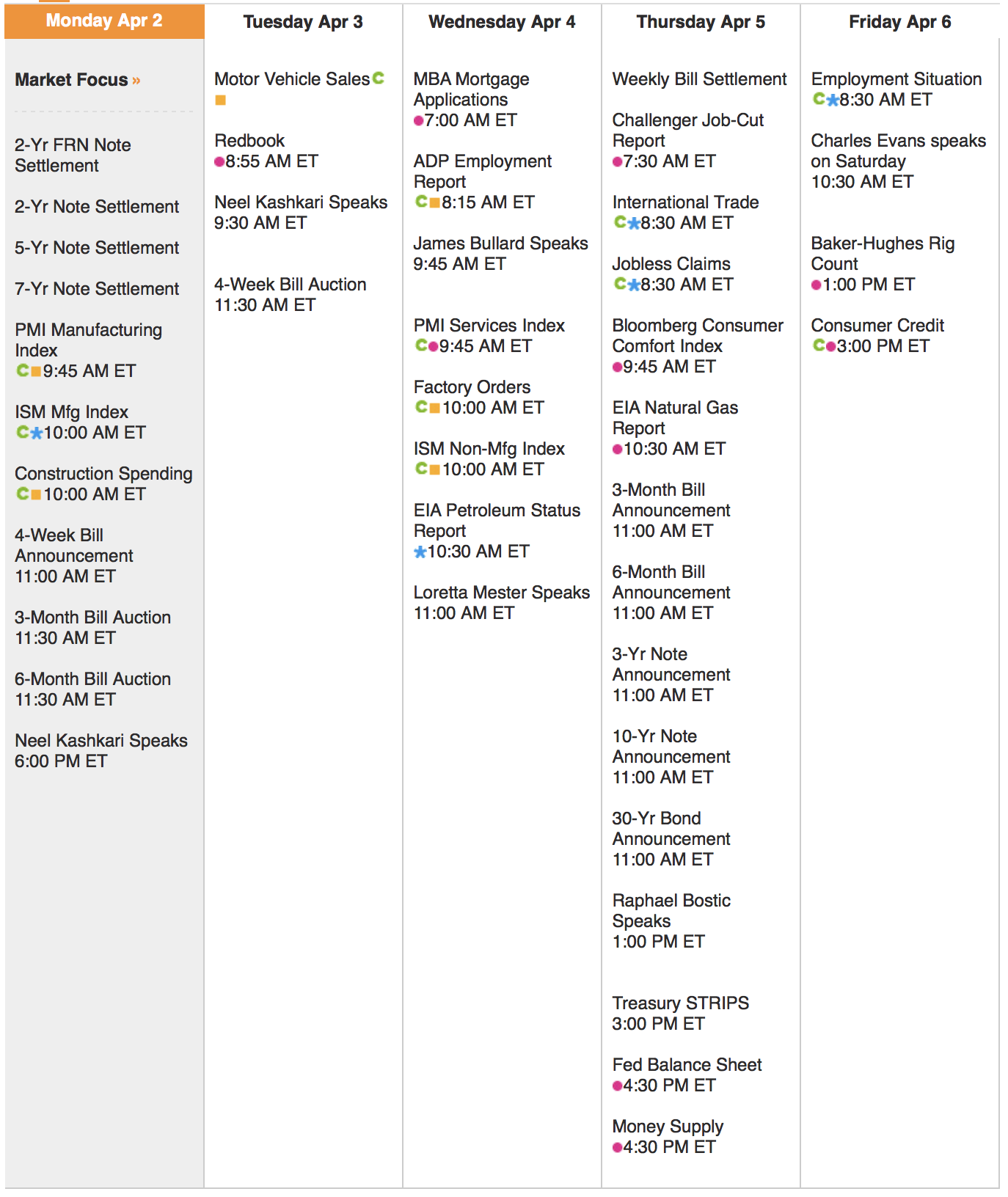 Jeff 5:37 am on Monday, April 2, 2018 Econ Calendar for week of 4/2/18 Be sure to periodically click Home/REFRESH to keep Bistro features updated. Jobs Report is Friday at 8:30am ET.