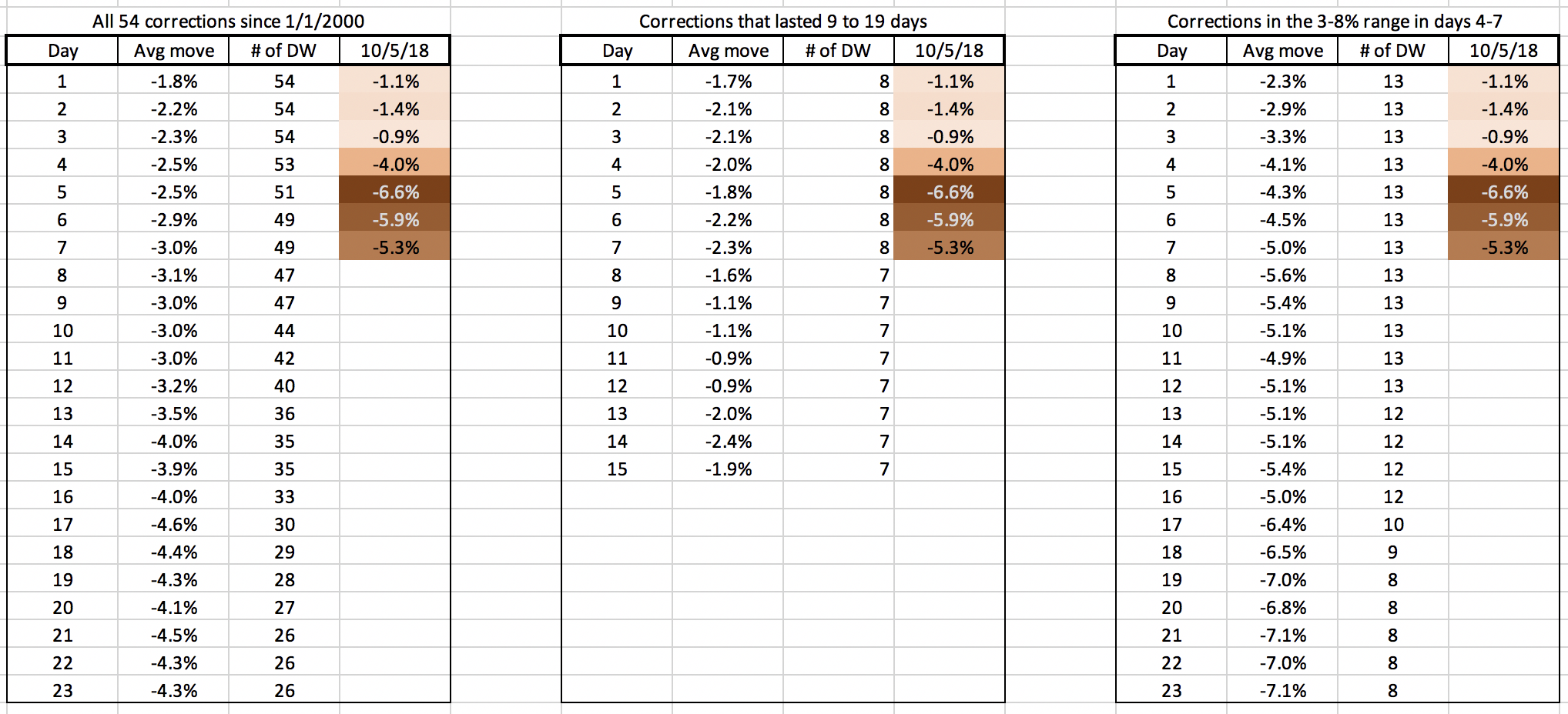 And the third chart is those corrections that were in the 4-8% range on days 4-7, just like our current one. This data suggests we may stay in the current range (down 5% or so) for several days to come).