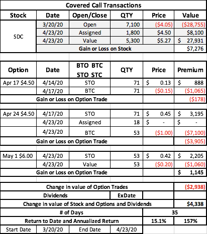 Assigned on 18 of 71 calls last night. Rolled Apr $4.50 up and out to May 1 $6.00. Stock was at $6.00 when I did the roll….then reversed and gave up any gains. Probably should have waited until tomorrow but I didn’t want more called away.