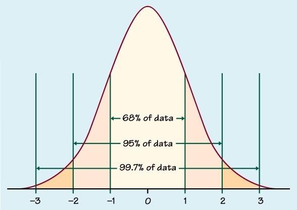 Normal implies there are equal odds the market falls 1% or rises 1% versus the average change. The graph below depicts a bell-shaped curve. The diagram also highlights standard deviations and the percentage of data that falls within each deviation.