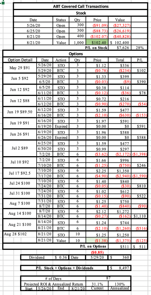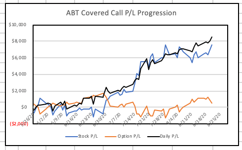 Our Covered Call strategy on ABT was established with the purchase of 300 shares on May 26. Since that time we have added to the position with 300 shares on 6/25 and 400 on 8/21. Covered Call strategy on Abbott has performed well aided by an upward move in the stock. We have rolled the options 13 times and had two expirations. Abbott is attractive for CC Writing as it trades weekly options, potential for growth on the stock price and pays a dividend.
