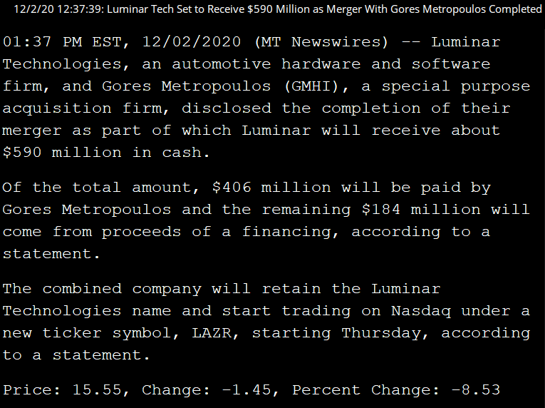 fuzzballl 12:48 pm on Wednesday, December 2, 2020 GMHI and LAZR Here’s one to keep an eye on. My ex’s hubby is an engineer at Luminar. They make the lidar radar for self driving cars. BTW TSLA does not use lidar. All cameras and computers instead.