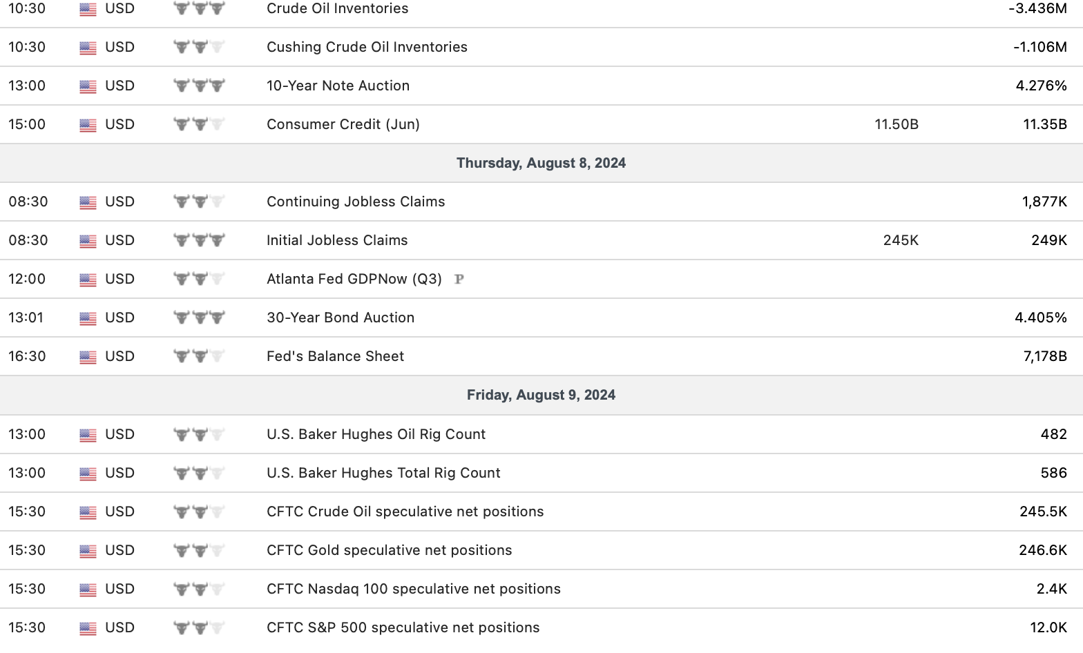 Jeff 9:40 am on Sunday, August 4, 2024 Economic Calendar 8/5 – 8/9 Relatively quiet week for data, after Services and ISM PMI on Monday.