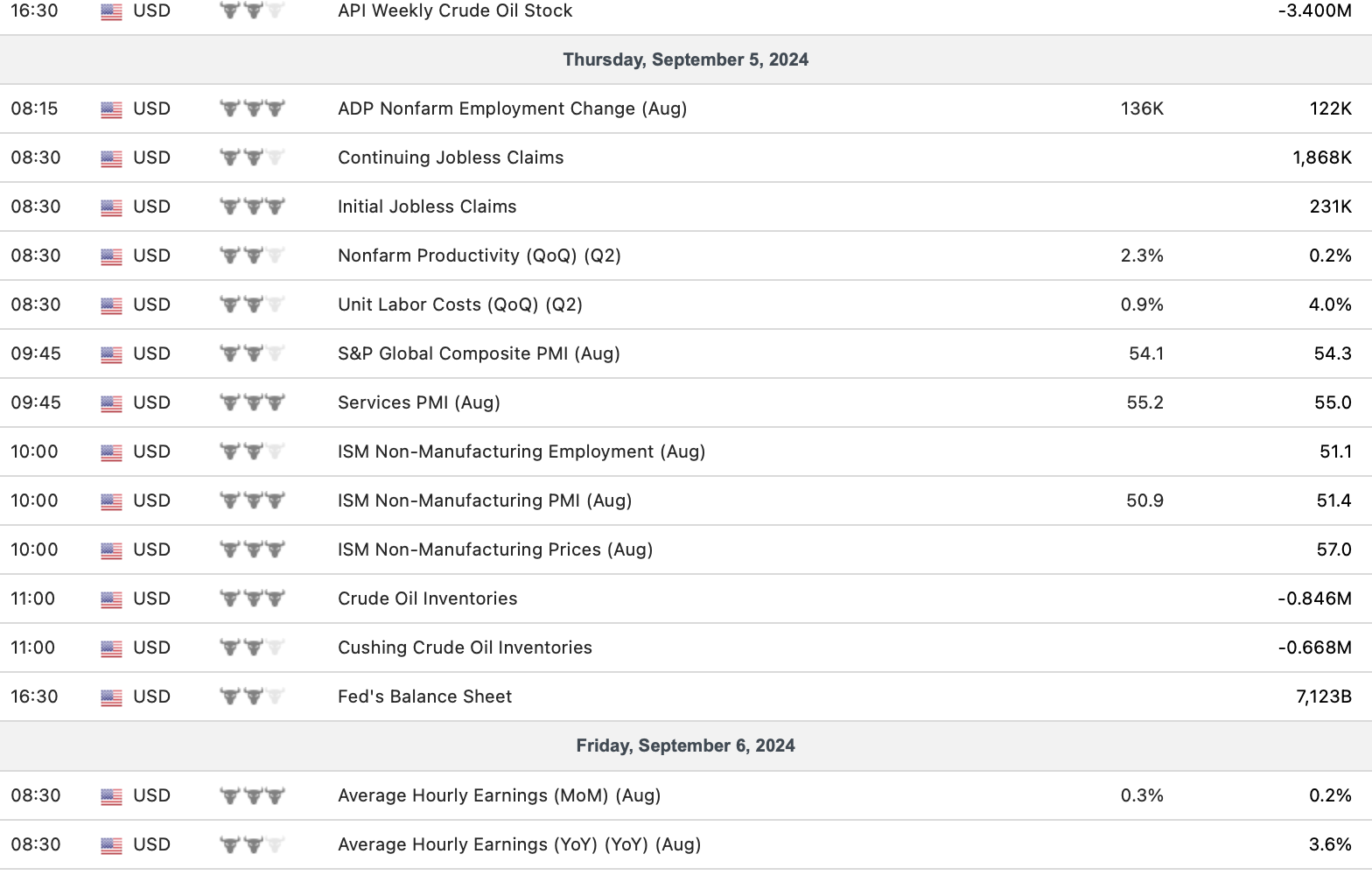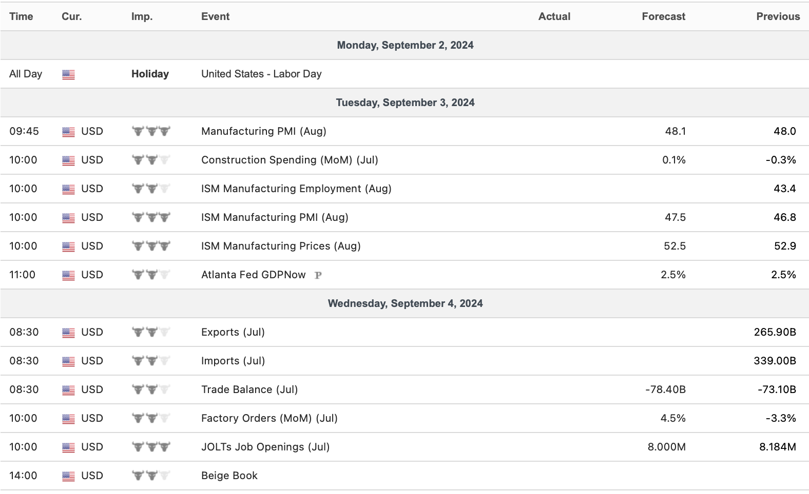 Jeff 9:16 am on Monday, September 2, 2024 Economic Calendar 9/2 – 9/6 ISM, JOLT, PMI, August Jobs report