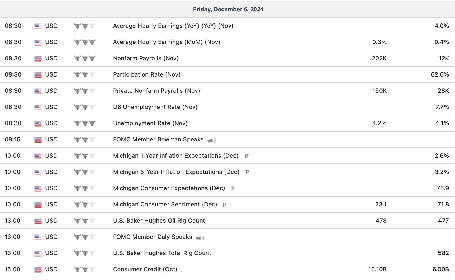 Jeff 6:06 pm on Sunday, December 1, 2024 Econ Calendar 12/1 – 12/5 A little something every day culminating in Jobs report on Friday.