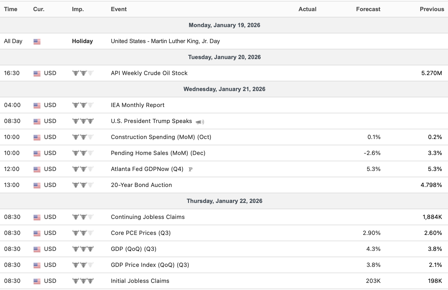 Econ Calendar 1/19 – 1/23