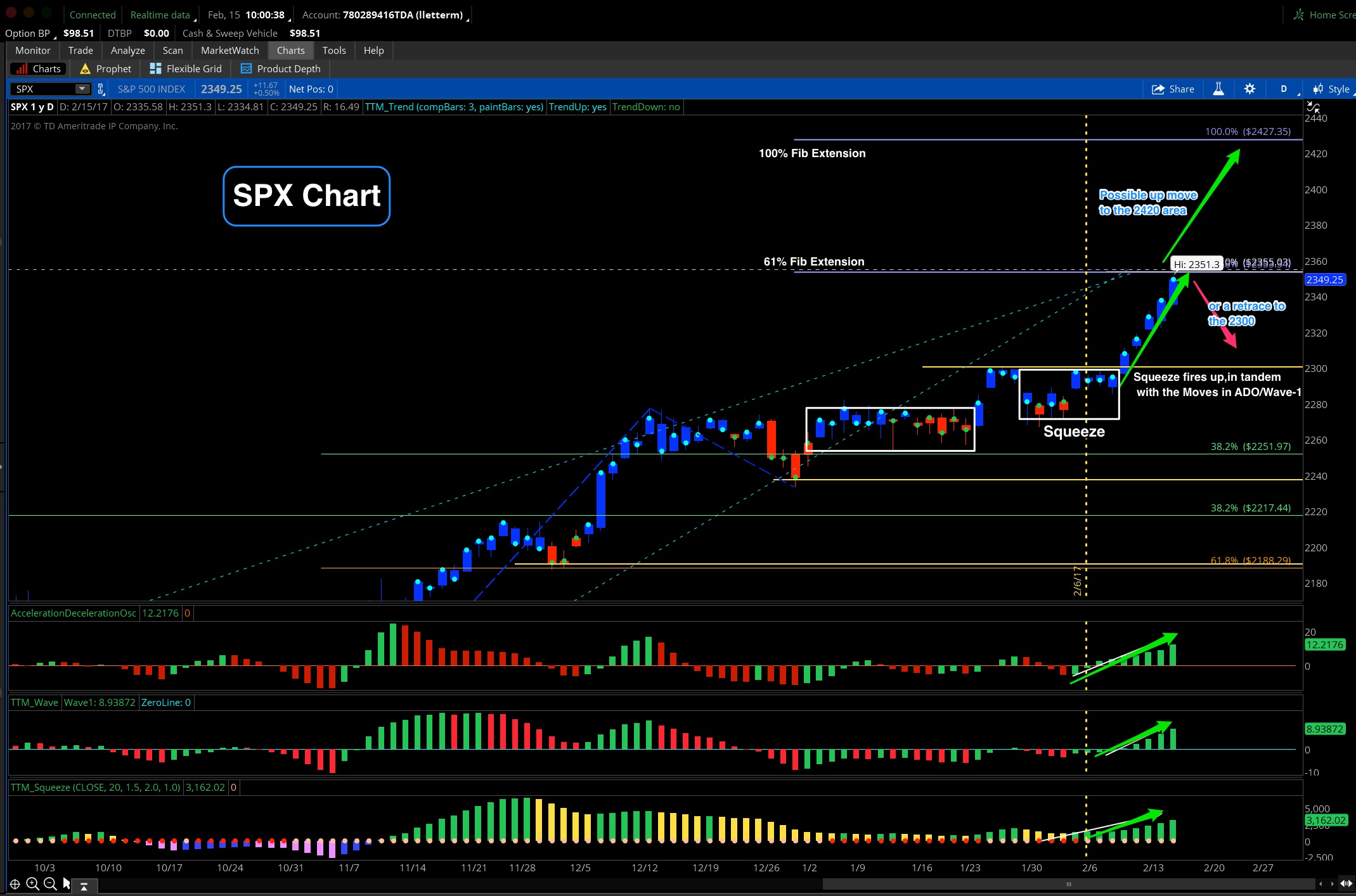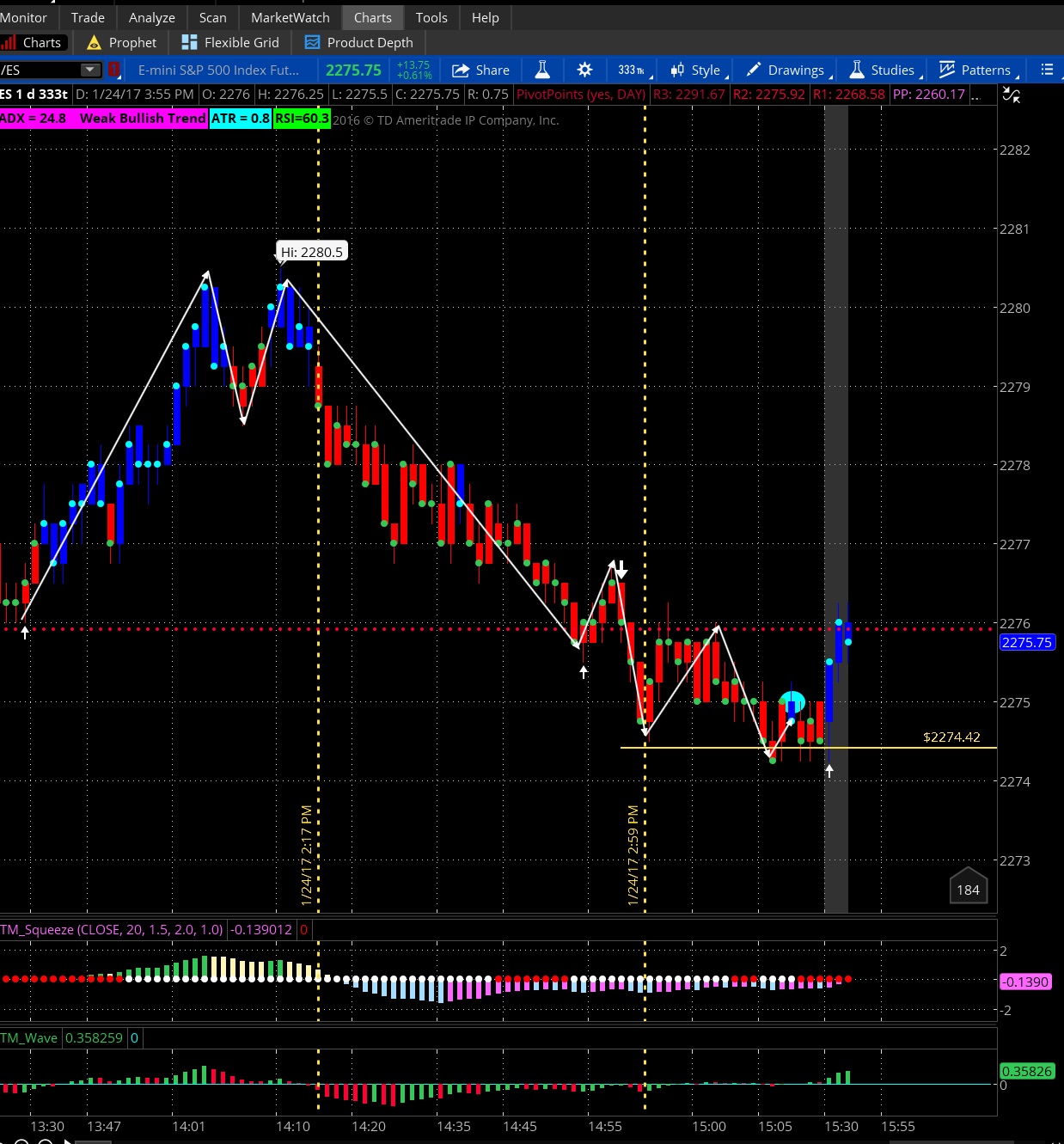 Feb 01 9:14am Exited my trade at the 2277 as the Squeeze and Wave bars changed direction..