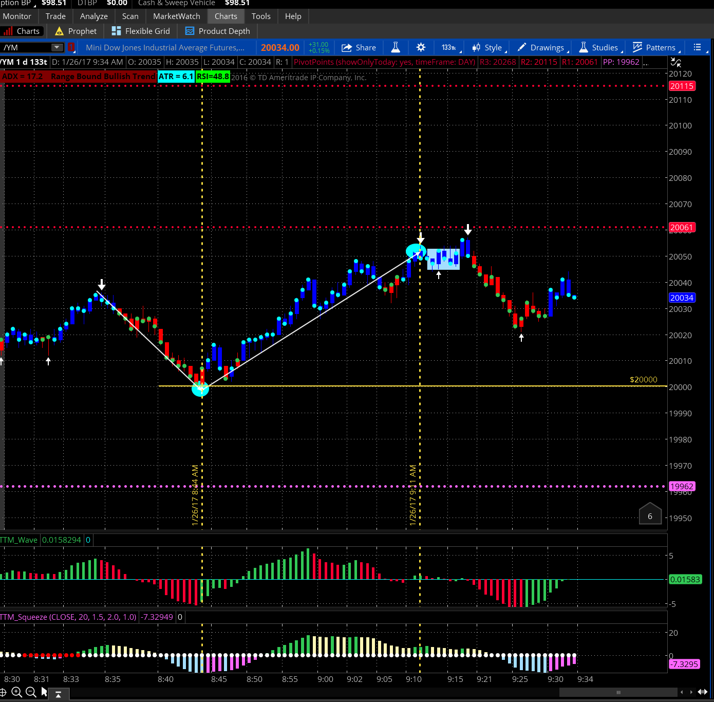Jan 26 9:11 Exited my trade as the YM stalled at the 20,050 level and consolidated..TTM_Wave verified the chop..