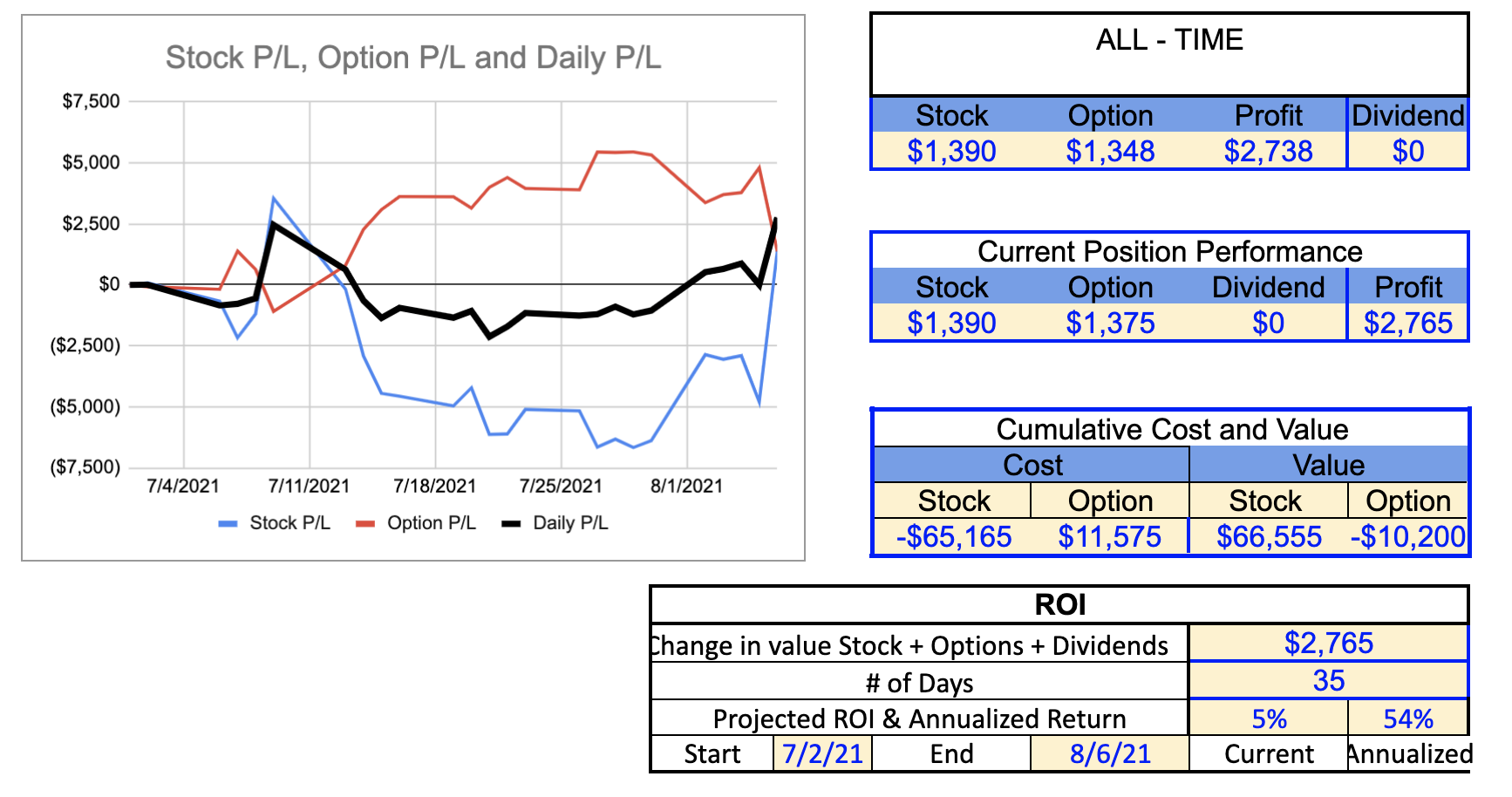 Ideally the black line (net profit) should be above the blue line (profit/loss from the stock). As you can see in the charts below it is a challenge to get the black line above the blue line. When the stock price drops and I make money on the short calls it out performs the stock but when the stock goes on a run the loss on the options tend to offset the gains.