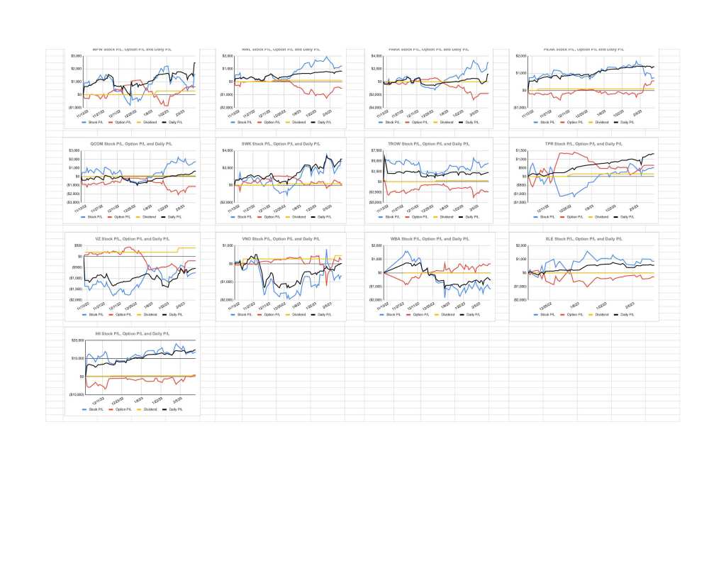 Over the past few years I have been working to evolve a system for tracking my positions that doesn’t take a lot of time. It has been informative and helped evolve my trading practices. I am able to download my current portfolio and daily trades (custom date in historical trades using current day as the starting date) from my Schwab accounts. Once they are downloaded the google sheets program does the magic and gives me my performance for each of the positions generating a graph like the ones below.