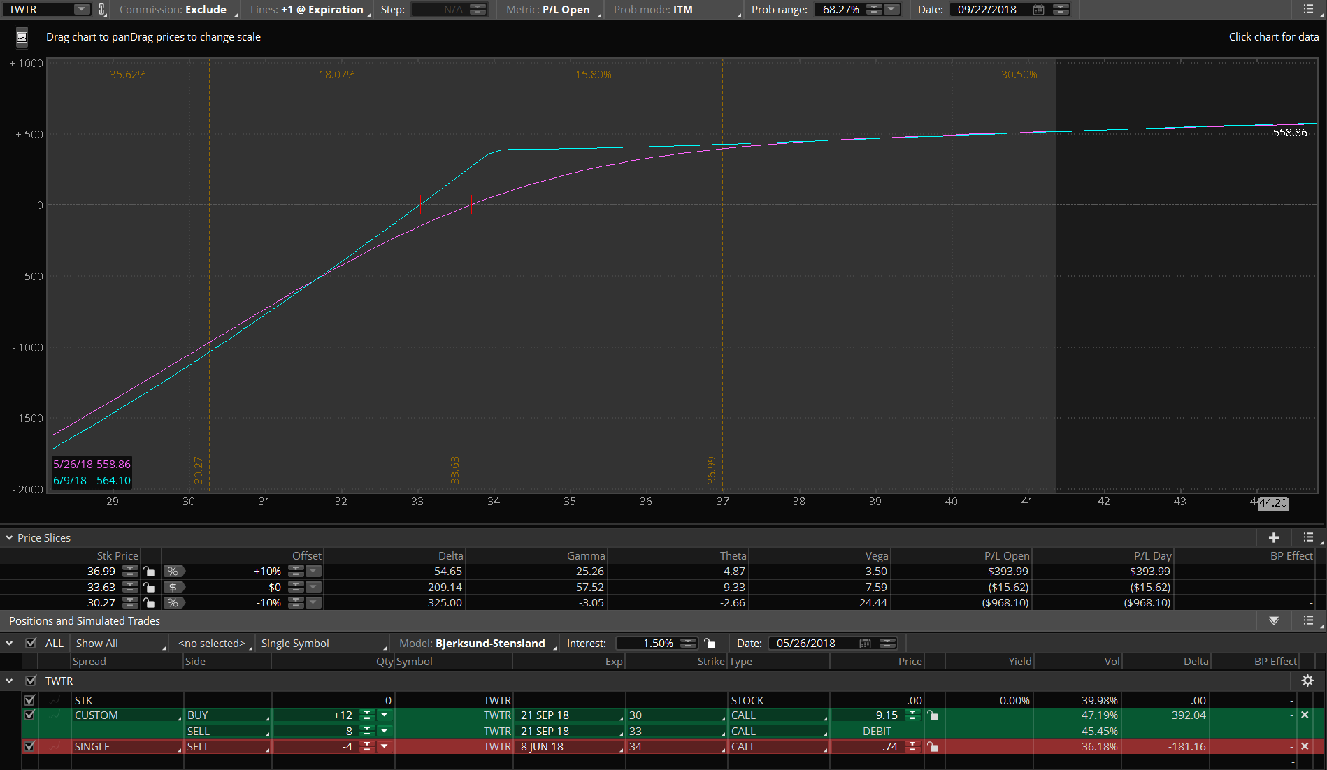 2. TWTR #CoveredBackRatio Sep 30/33 12×8 @8.94 (Total risk = $8.94×400=$3,576). Sold June 8 34 calls @ .73, short call = 8.2% RoR. TWTR position is equal to $32.86 stock price, current price is $34.10.