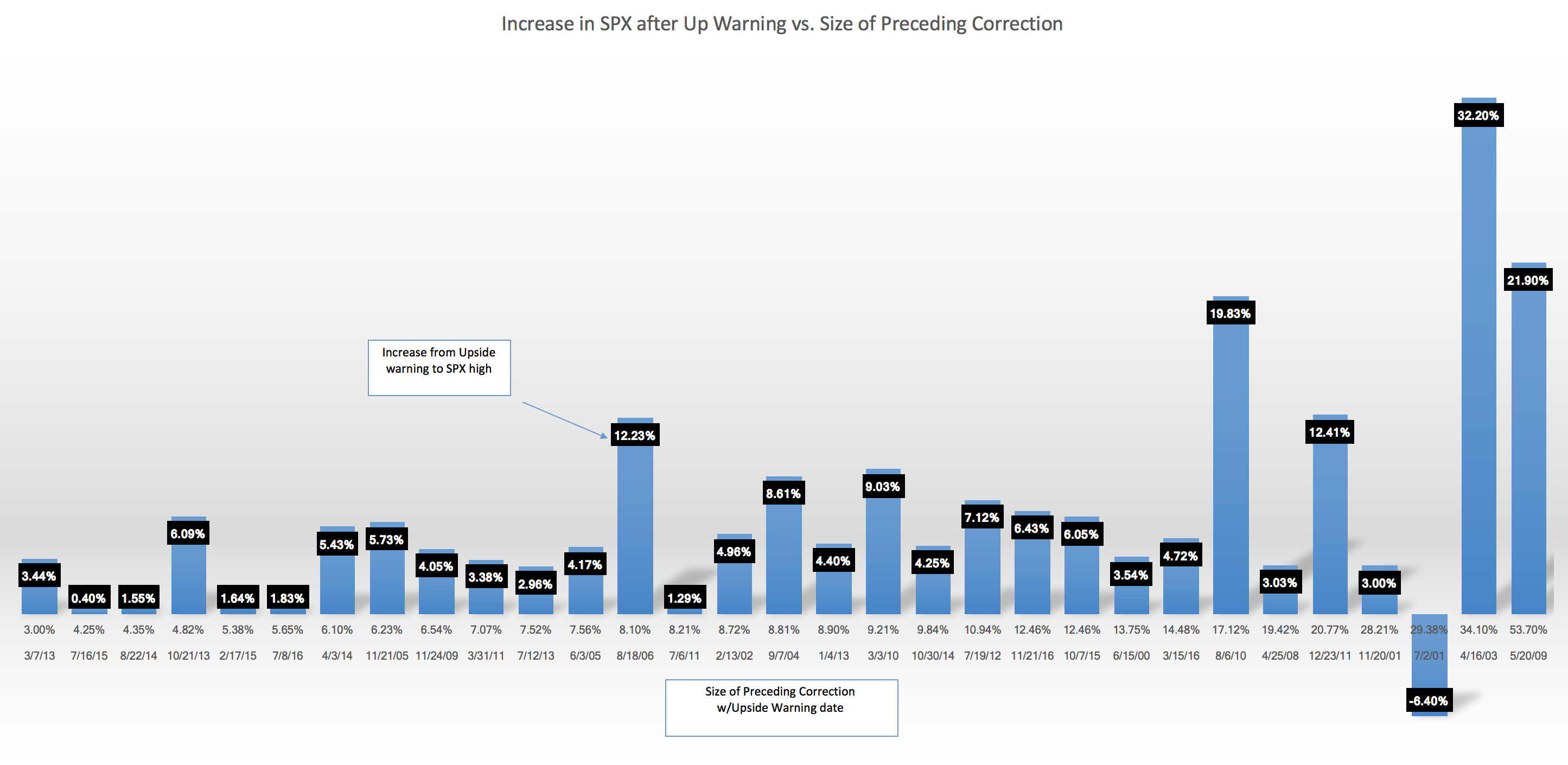 I’ve created a chart to compare the performance of Upside Warnings with the correction that precedes it. The bigger the correction, the bigger the subsequent rally in the SPX. This is no surprise, but I wanted to see how it charted from all Upside Warnings since 1999. The mini-correction we just had was exactly 3.00%, which is tied for smallest with one in 2013. So the move up we should expect now is relatively minor. The first bar on the chart is that 2013 example… SPX increased 3.44% from the close of the Upside Warning day to the next SPX high. A 3.44% move this time would be a high of 2469.58.