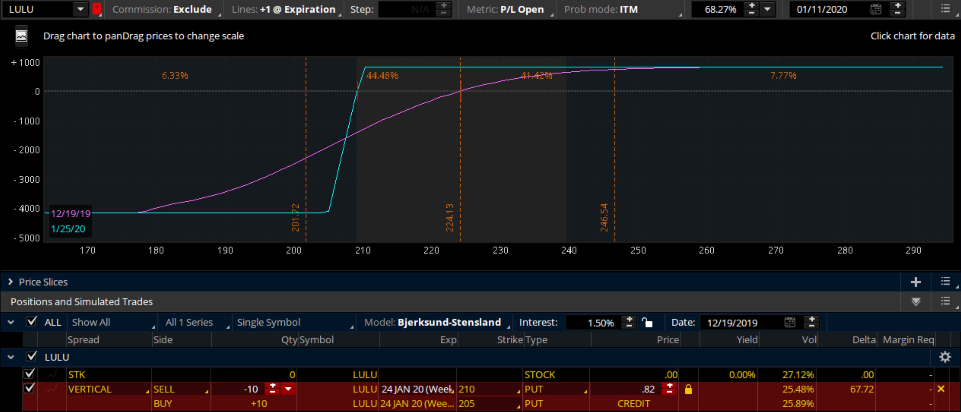 Sell 10 Jan 24th 210/205 BuPS @ .82 for $820 premium.